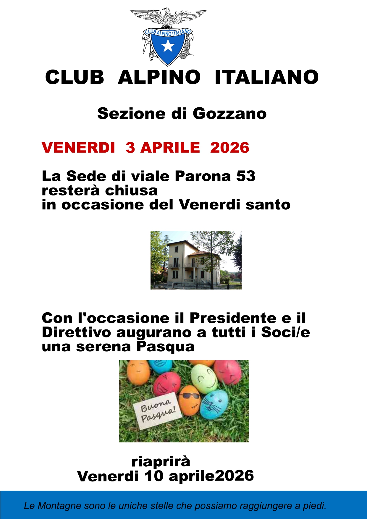 AVVISO AI SOCI il 31 marzo scade il termine per il rinnovo delle quote sociali 2026 e per poter usufruire delle assicurazioni in attività sezionale. Invitiamo a voler rinnovare con sollecitudine perchè il valore della nostra associazione siete Voi soci. Vi aspettiamo ll venerdi in Sede oppure presso il negozio Ferramenta Ruga . Grazie